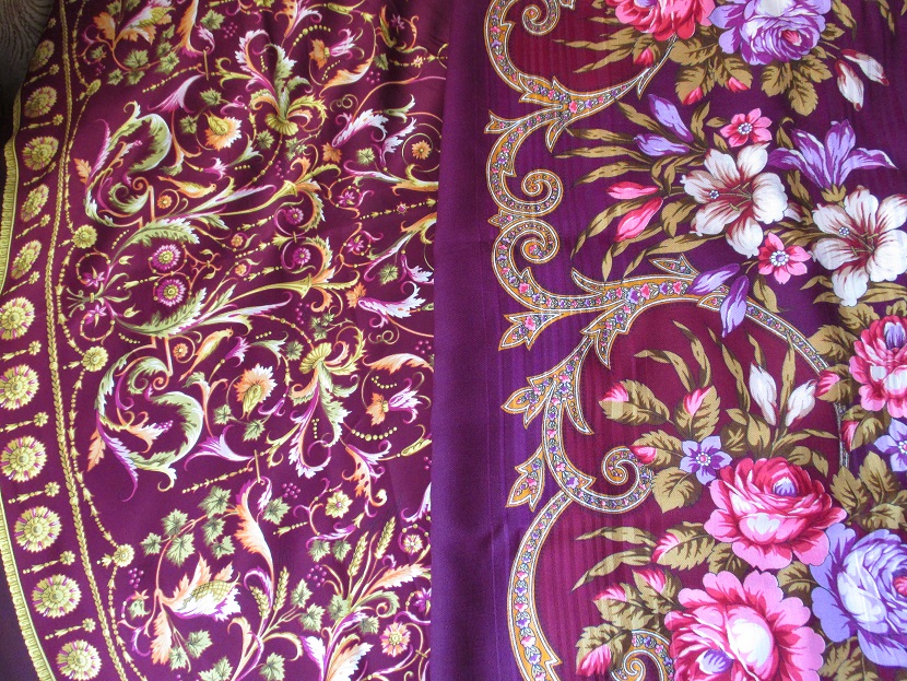 ТВечера - оба напечатаны на терракоте, теплой кирпичной основе, рисунок орнамента очень плотный, струящийся, обе шали в этих колоритах переливаются золотом/серебром, при этом 4-й колорит показался поярче)