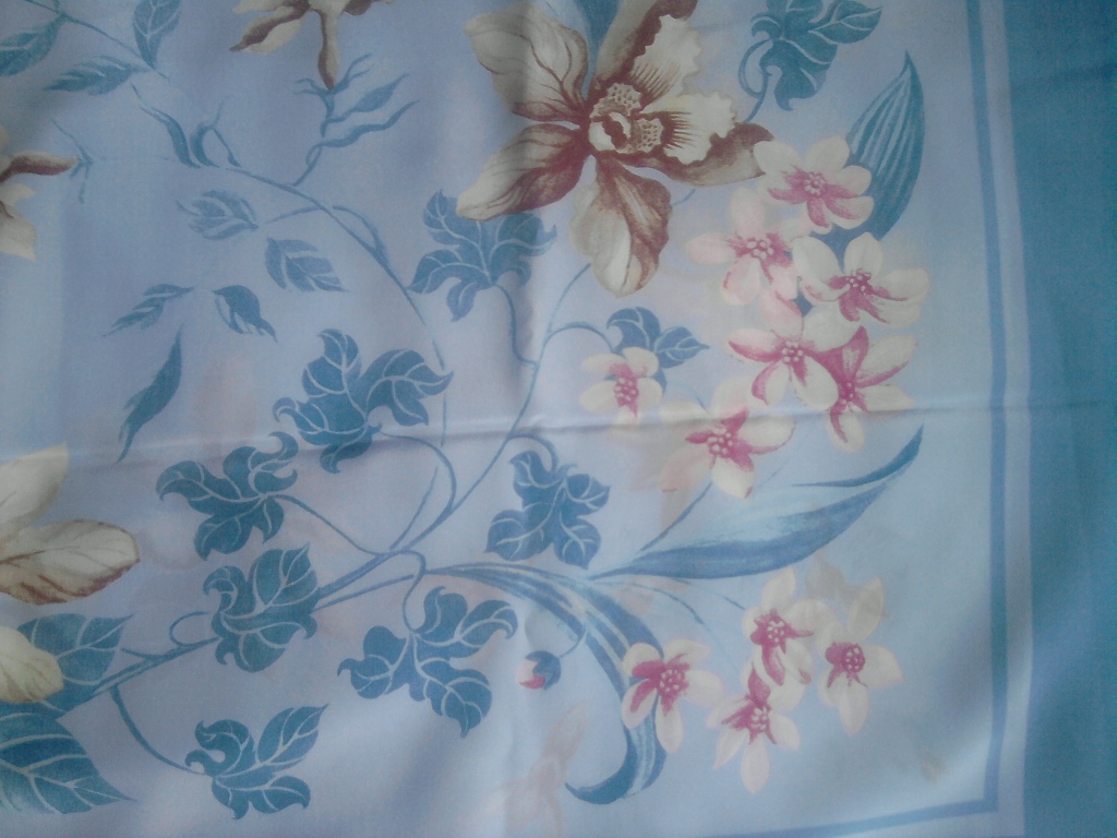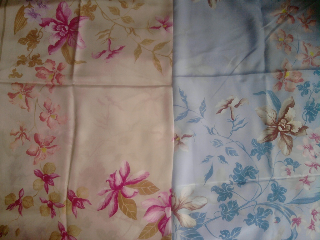Орхидеи нарисованные одним автором на разных платках, снимала сейчас в сумерках комнаты, а второе и третье фото при включенном свете для сравнения плотности зеленого цвета.