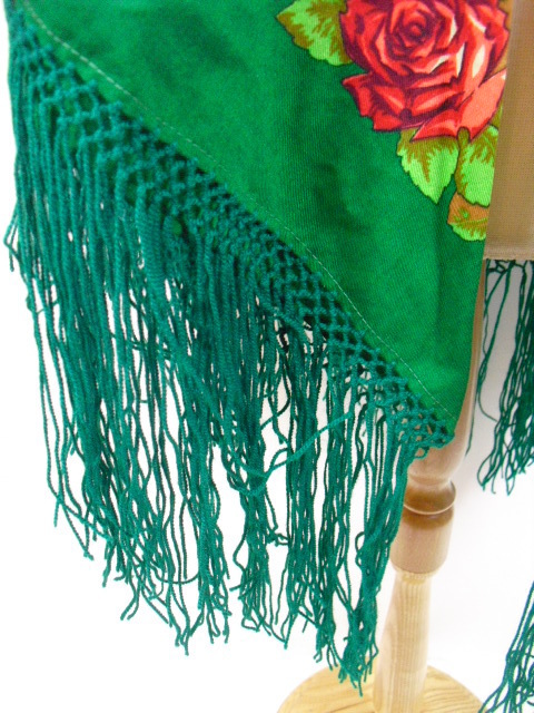 Во-вторых, эта зеленая шаль сразу напомнила мне жостовские подносы почему-то. Качество печати, как мне кажется, уж больно хорошее, один виноград чего стоит. Продавец (шаль в Англии) пишет, что шаль очень старая, плотная, размером 53 дюйма сторона (примерно 135 см). Хотелось бы, чтобы это был старинный платок, да? :-).
