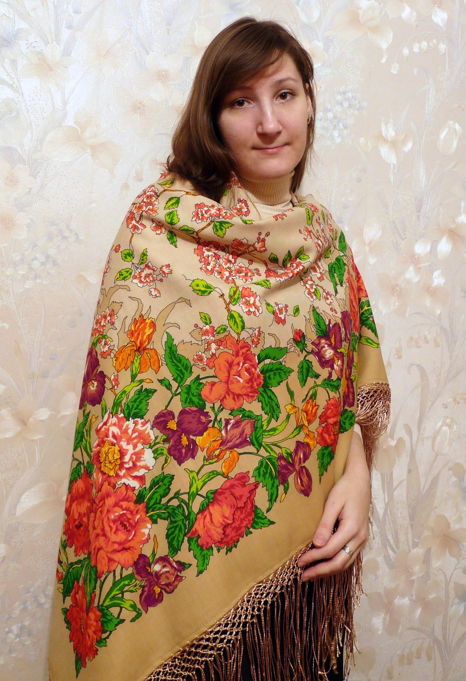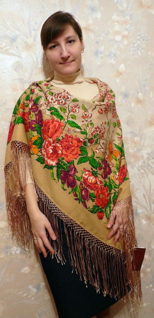 Фотографировала при искусственном освещении без вспышки, платок на фото получился теплее, чем на самом деле и менее контрастным.