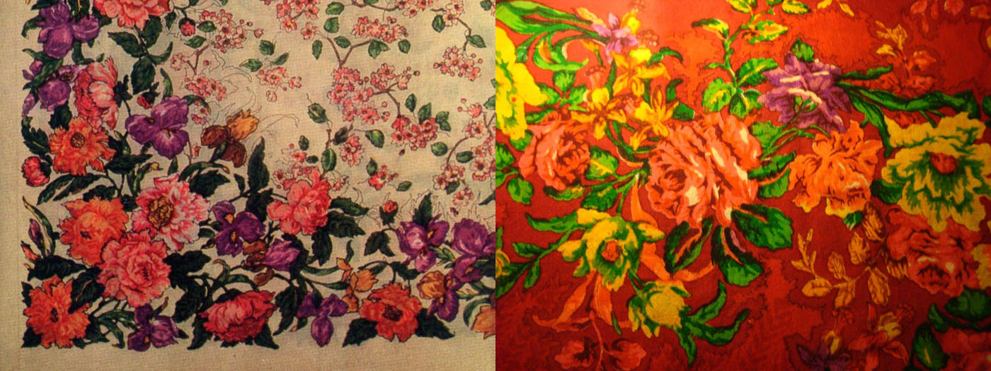 Lara, спасибо за красоту. Не пойму, как такую набойку делали, с колосьями и надписью. Как обычную - ролик смотрела. А здесь? По более светлому тону таким же цветом набивали? Очень интересно. С Цветущим садом очень много сходства. Хотя цветы такого типа (лохмателькие) есть и еще на некоторых платках. Может быть, тогда такой стиль был?