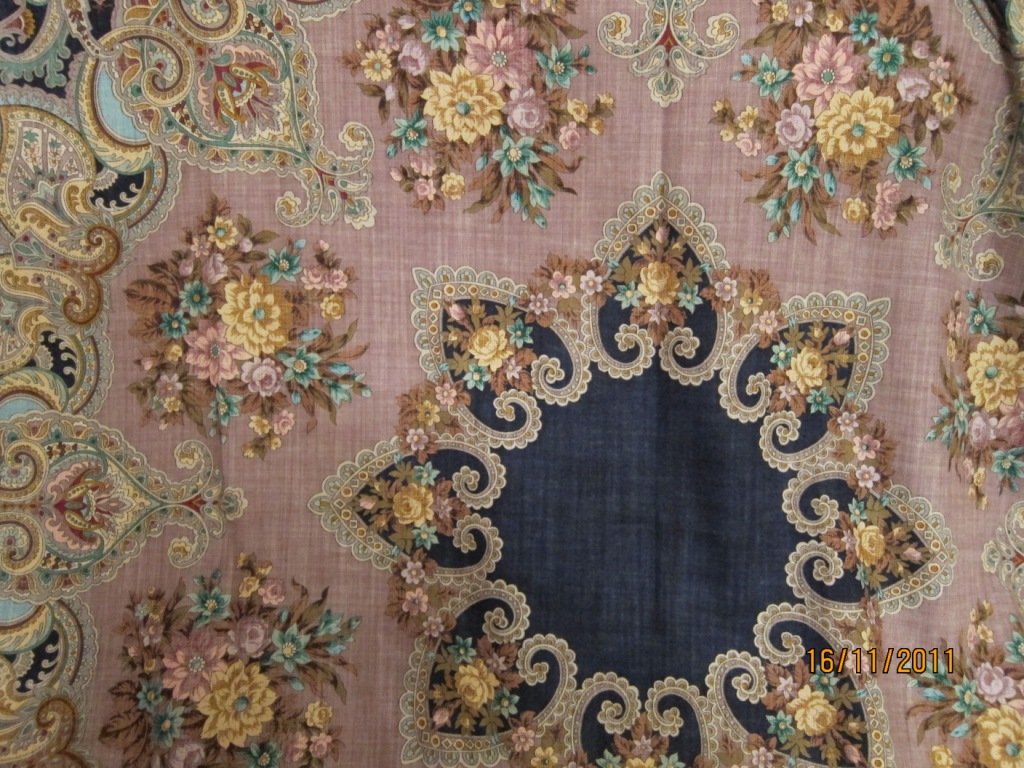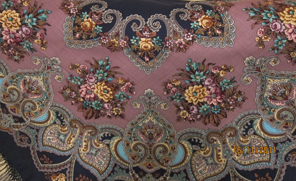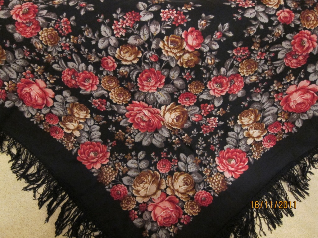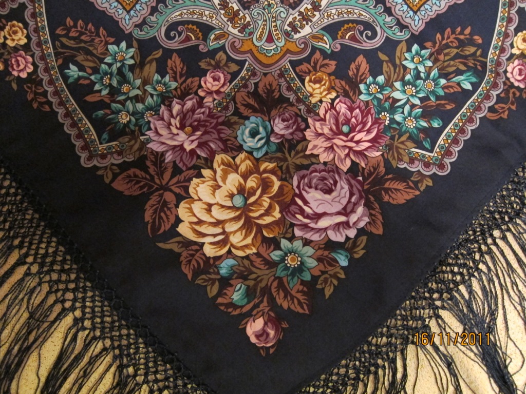 Мне очень нравится рисунок Русского сувенира, я все бью себя по рукам, чтоб не прикупить с темно-зеленым краем из ограниченной серии - но вот с чернопольным бы наверняка не удержалась. Роскошная шаль.