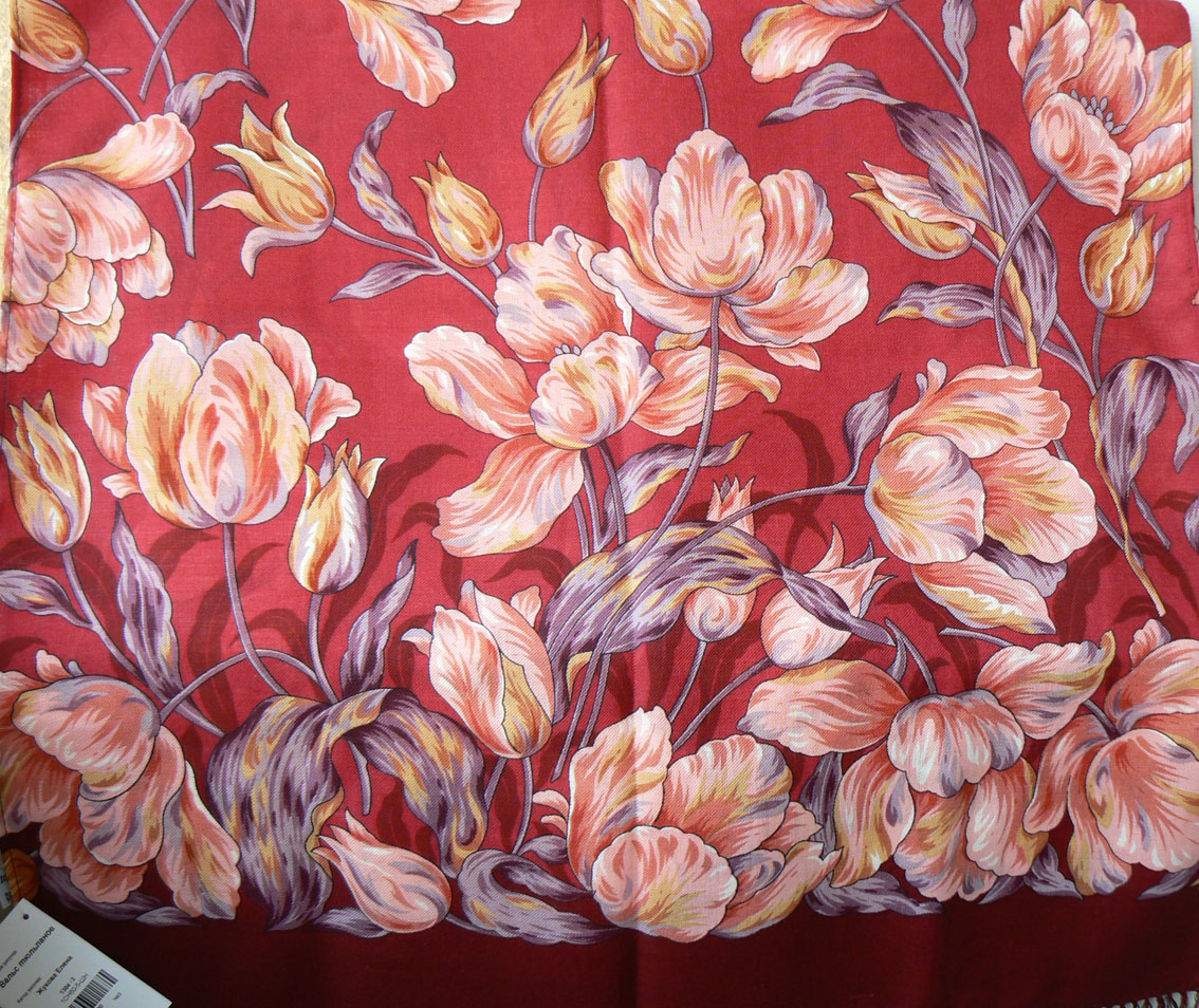 Особенно мне понравилось как выглядит рисунок на платке, сложеном пополам. Если закрепить его спереди красивой булавкой, то получается красивая накидка на плечи. А вот для повязывания на голову такой рисунок вряд ли подойдет, несмотря на размер платка.