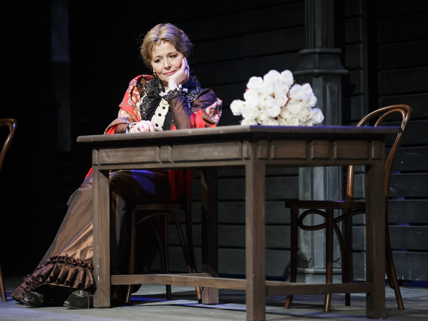 Алла, вообще, да, если костюмы исторические, то и платки должны быть старинными, из сундука. Но, что касается спектакля Васса Железнова в Малом, то это не совсем так. Я смотрела этот спектакль и видела то, что не видно на этих фото - декорация там довольно условная. На фото мы видим как-бы реальный интерьер комнаты, но если бы камера отъехала, то мы бы увидели, что эта комната - это всего лишь стены, которые висят в пространстве. То есть, дом Вассы - это не реальный, живой интерьер, а некий образ - дом, в котором нет жизни. Деревянные балки, через которые сочится свет, потолок, который то нависает, то растворяется в пространстве. Художник-постановщик - гений нашей современности Эдуард Кочергин. Вот фото из спектакля, которое даёт более общий план.ALLA OK. писал(а):А мне современные платки в старинных интерьерах глаз режут. Из бабушкиных сундуков им костюмироваться надоть!