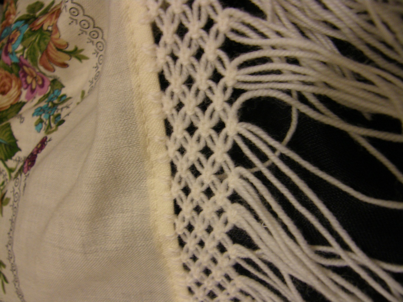 Alenushka, я такую бахрому сделала на черном палантине. Еще в школе мы изучали технику макраме. Так вот эти узлы оттуда.Очень хорошо что разглядела как смотрятся узлы на светлых нитках . Теперь попробую на других платках так сделать.