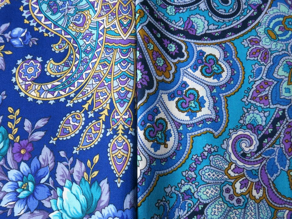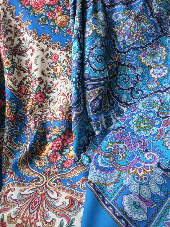 "Ласковое солнце" смотрится темно-синим,бисерным, "Королева красоты" ярче из за более крупного рисунка и больших по размеру фрагментов с белым и бирюзовым цветом- очень яркий, красивый по цвету (для любителей синего и его оттенков ) платок.