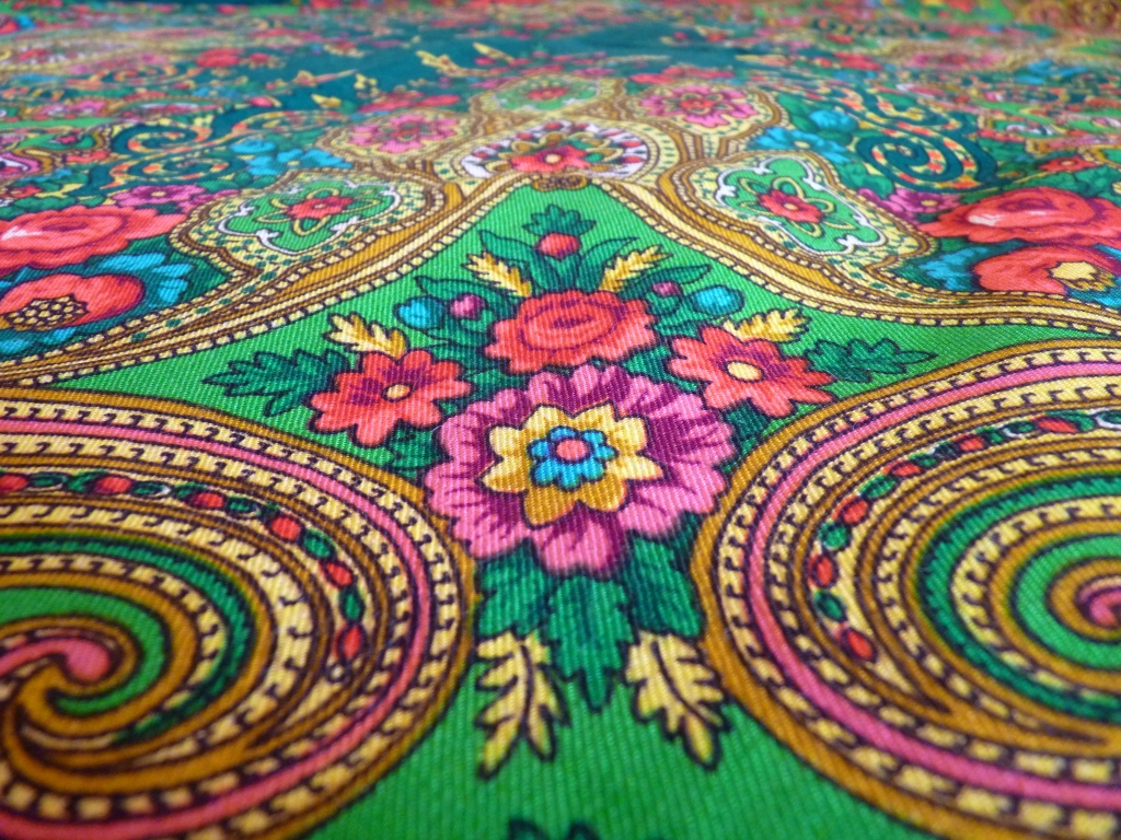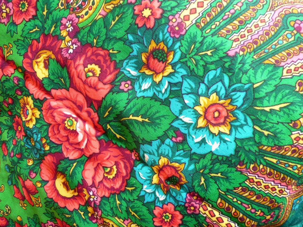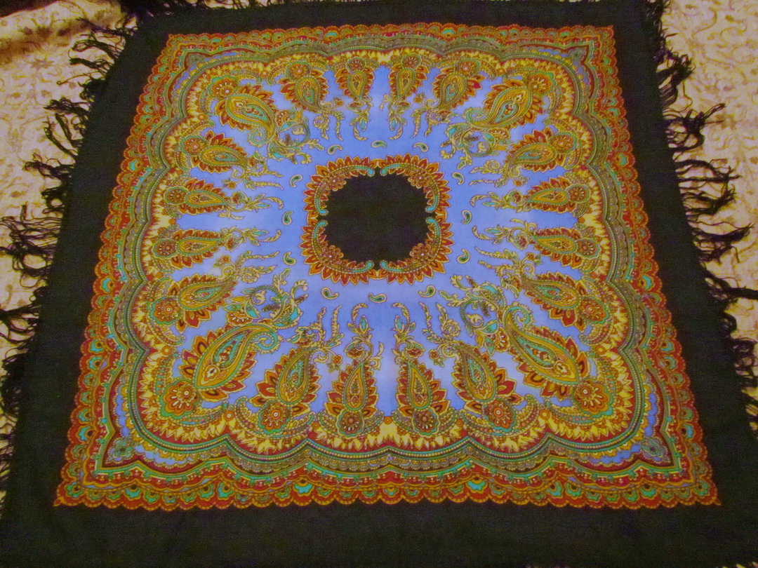 Нашла у мамы ПП шаль, вспомнила, что когда-то она ее часто носила под шубу. Рисунок показался очень знакомым, но колорит необычным. Принесла домой, сравнила, оказался зеленый Разводной, но такого варианта в базе не нашла. Кисти у шали вязаные, шерстяные. Печати ППМ не обнаружила и у мамы забыла спросить, когда она ее покупала.