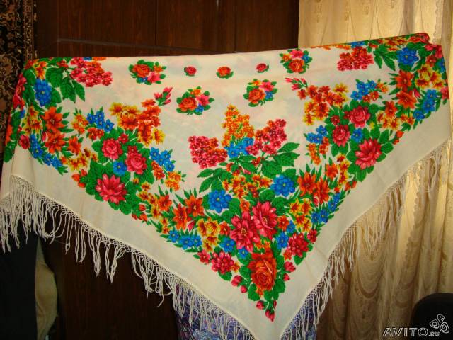 Платок "из закромов" 90-х годов. Размер 146, шерсть тоньше, чем у нынешних; бахрома с ячейками похожа на хлопковую, а может, это шерсть такая...