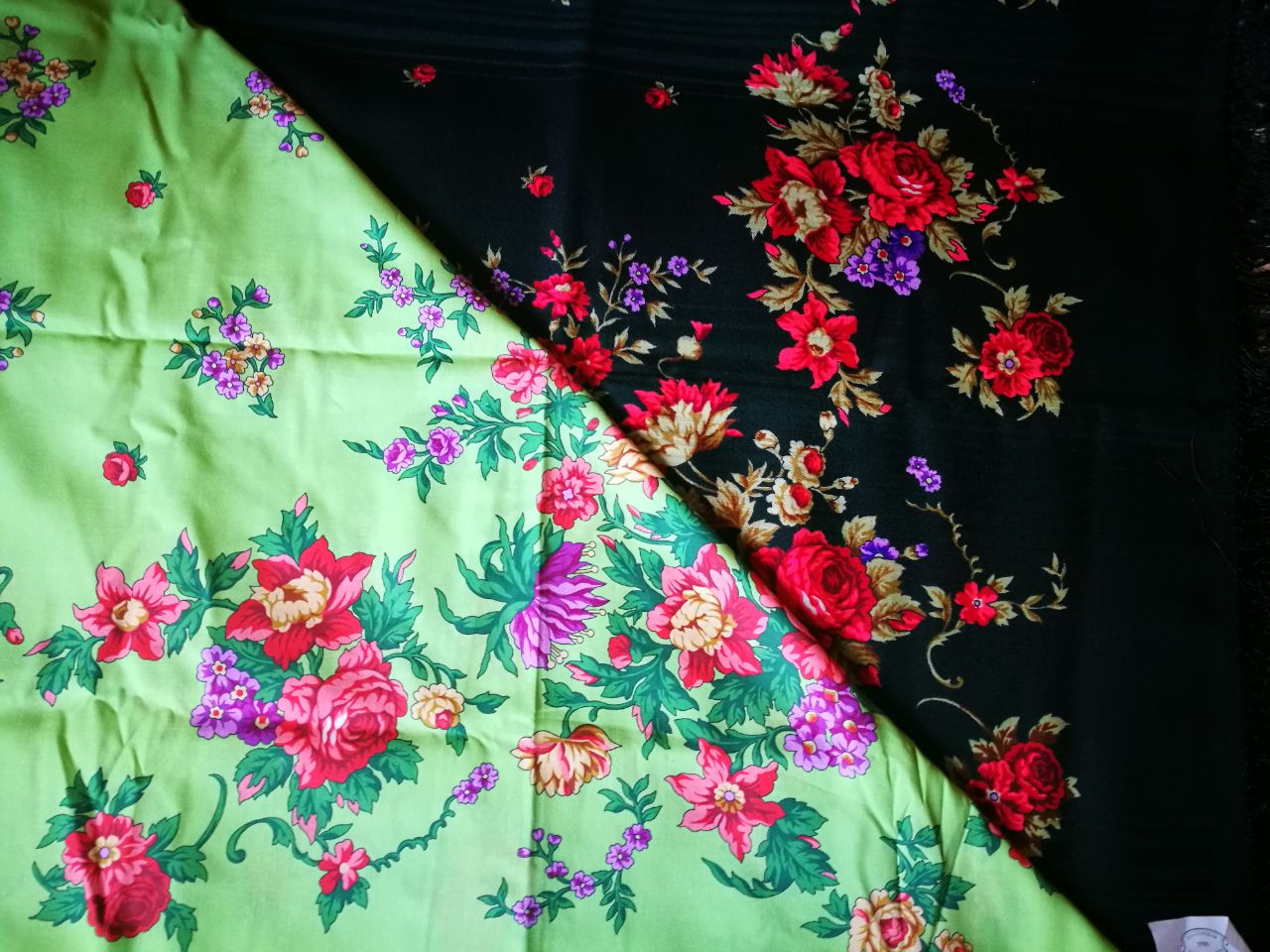 Просто в хлопке платок воспринимается по-другому, совсем, мне очень нравится в хлопке, но, как другой рисунок, а середина вообще мелкие букеты заменили одинокие цветочки.