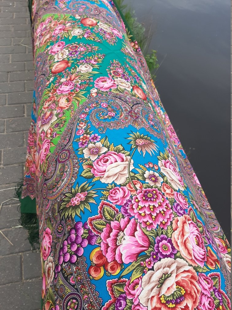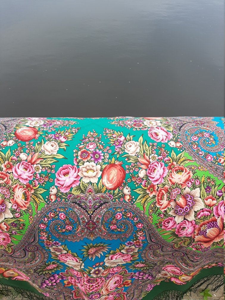 Мне очень понравился платочек Т. Сухаревской. Свежий, сочный, натуральные оттенки! Говорят, что "летний", но думаю и зимой будет актуален. Ткань тонкая. Комфортный, легко драпируется. Шерстяная бахрома утяжеляет немного такую ткань и рисунок--можно переделать на длинную ,"шелковую".