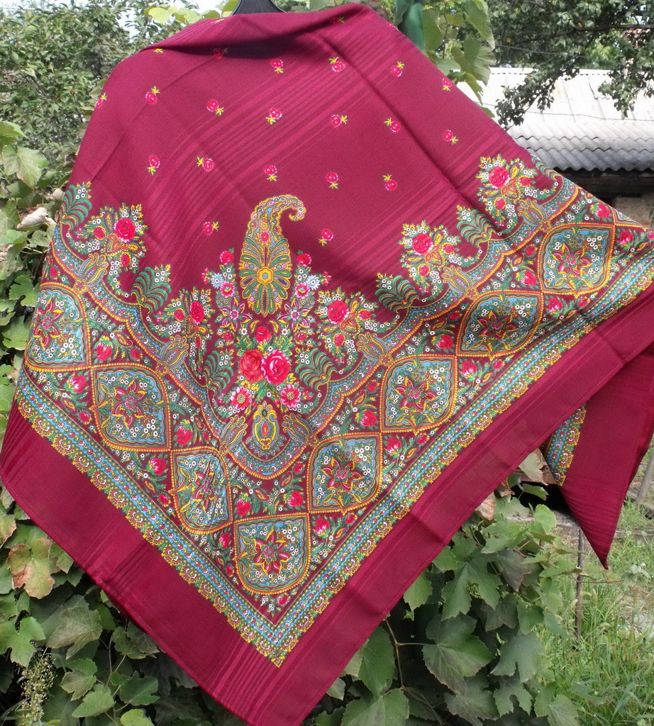 Фото к сожалению цвет не передало, а ничего подправлять я не стала. На самом деле колорит цвета вишнёвого варенья.Цвет очень красивый и очень восточный. На ярком солнце платок кажется светлее, на самом деле он не ярок.