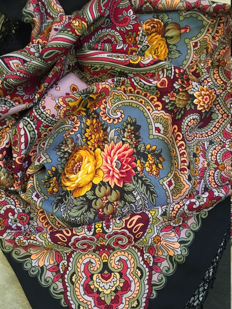 У меня это 2 года примерок, с решением отказаться от Сказок, потому, что не мое все было. Настолько не мое, что не только колорит, но и сам рисунок уже вызывал большие сомнения. При чем, в одном магазине продавец сказал, что вообще не понимает вздохов по Сказкам, типа они все топорные и грубые. Я уже писала об этом. А ему, продавцу, просто не посчастливилось увидеть шаль во всей красе, а может лень была детально ее изучать и сравнивать каждое поступление. Я целый год потом ходила с мыслями, что мне топорная шаль не нужна. А она не топорная и не грубая! В русских сказках важно уметь видеть не только глазами, но и сердцем, не лениться и включать смекалку. Мне просто повезло найти свой экземпляр, который пришел сразу после встречи Нового года! И без лукавства, в выборе помогали подруги. Ключевые слова « если ты сейчас ее не возмешь, то вряд ли еще где то встретишь такой великолепный образец, такая яркая Сказка, просто особенная, а главное, тебе очень идет». Спасибо, девочки!