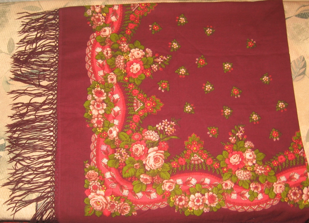 Платок 150см "БС" №7 (бордовый) с ярлыком "МППО"(Московское Павловопосадское Платочное Объединение -?):