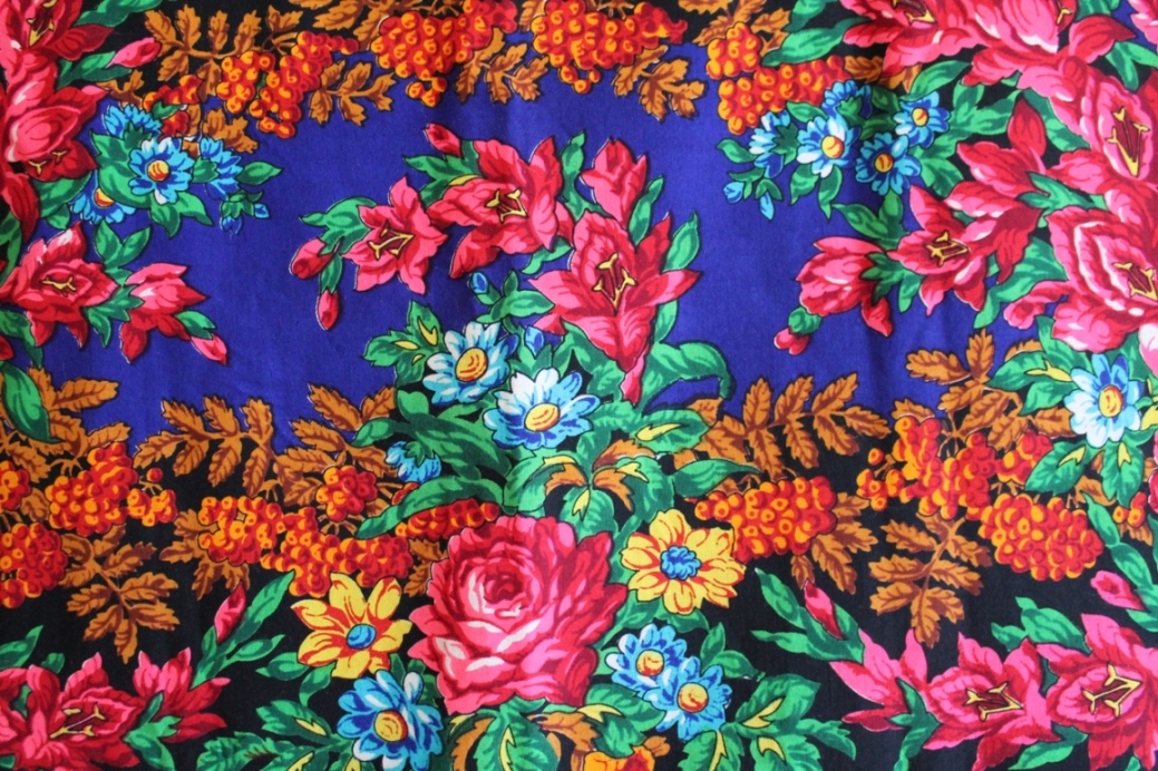 Приключилась со мной история сегодня... Пошли с утра гулять со старшей собакой .Возле дома у нас остановка, а возле остановки-стихийный рыночек. Все окрестные бабули приносят свои соленья-варенья зимой, грибы-ягоды летом, и торгуют. Сегодня. всё , как всегда-бабули, банки с грибами и капустой. А у одной женщины на ручку сумки на колёсах как-то стыдливо и неуверенно была накинута шаль. Шаль как будто стеснялась, что она вынуждена соседствовать с банками и тыквами. Бабуля при шали тоже чувствовала себя неуверенно. Мы прошли туда и вернулись обратно.Да, шаль продавали. Ну, мы с собакой сбегали за деньгами и принесли её домой. Потом стала уже рассматривать и идентифицировать свое приобретение.Оказался Аккорд неизвестного колорита( у нас в базе такого нет). Шаль без этикетки , поэтому колорит не знаю. Шаль в отличном состоянии, ни дырочек, ни потёртостей,очень яркая и чёткая печать. Куплена в 80-х годах.