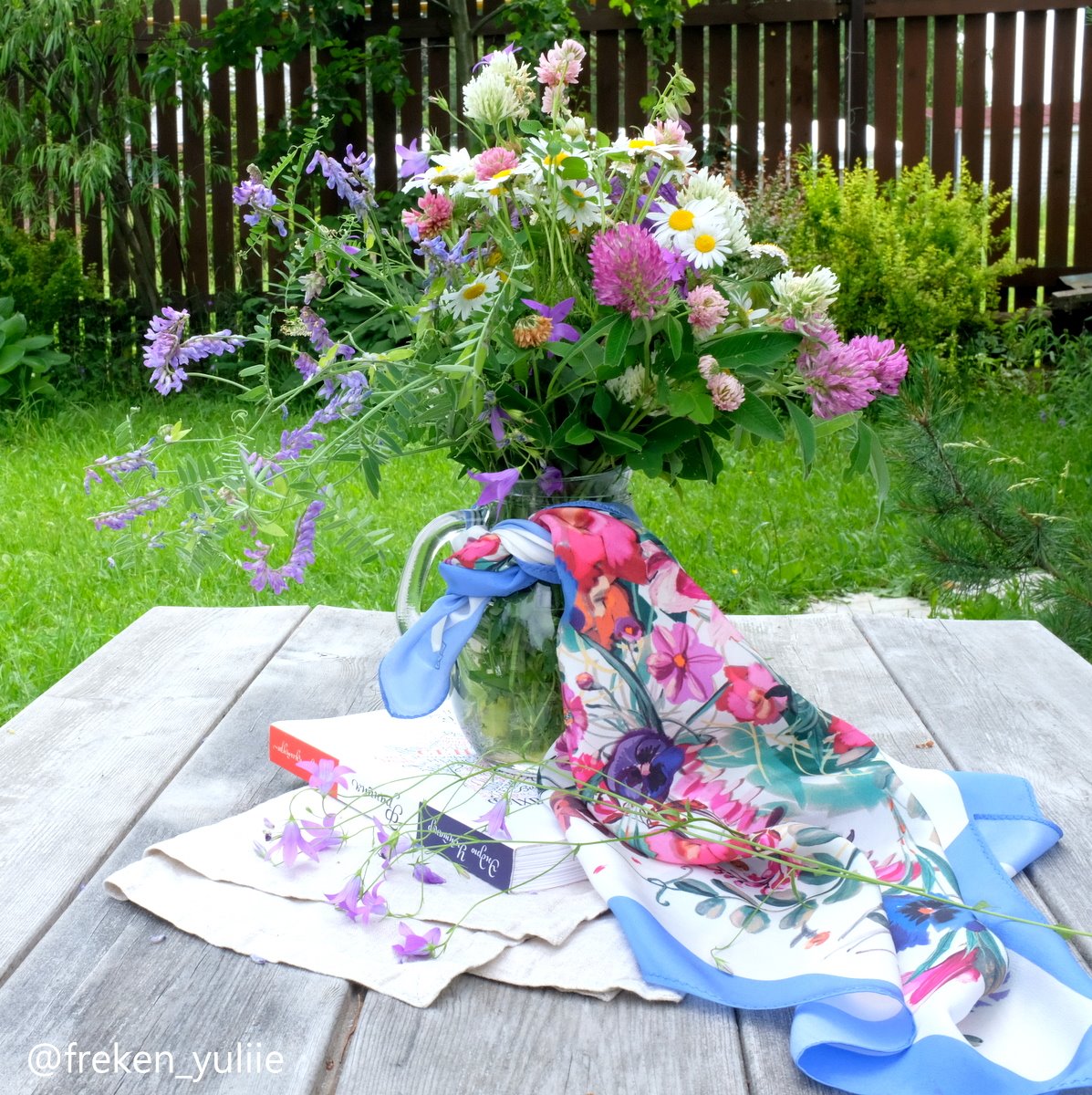 Примите и мой июльский букетик полевых цветов. И крепдешиновый платок Любимая полянка, на рисунок которого, как будто, перепрыгнули цветы из моего букета.