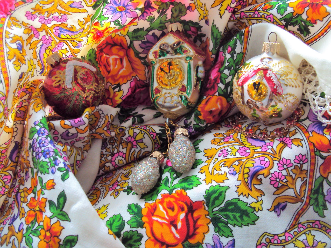 А Зарина, наоборот, эффектно поиграла яркостью красок на белом фоне Медальонов, подобрав очень подходящин по цвету игрушки. Даже удивительно, что существуют игрушки, настолько точно повторящие цвета шали.