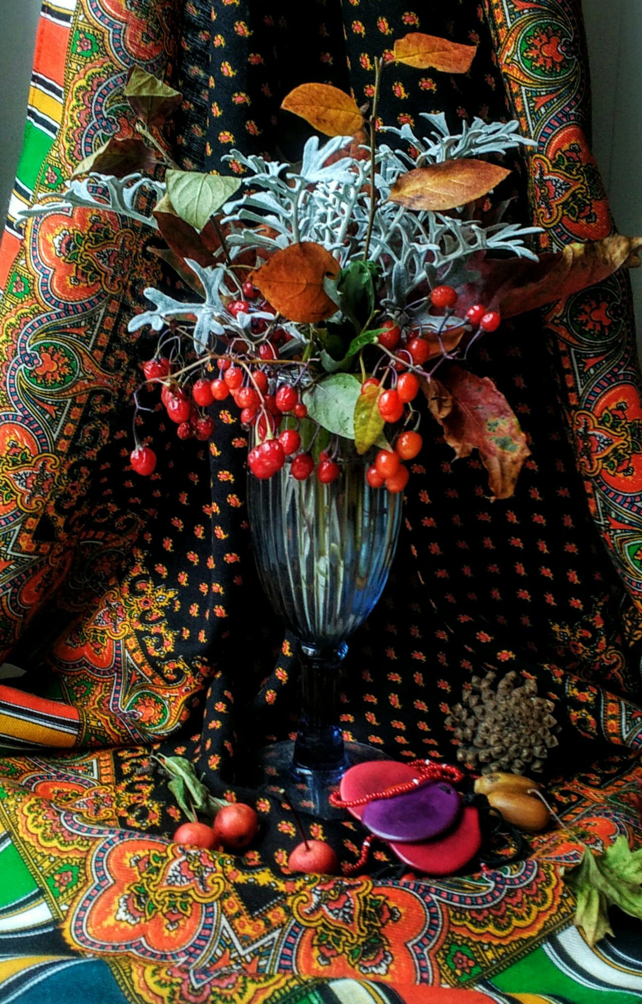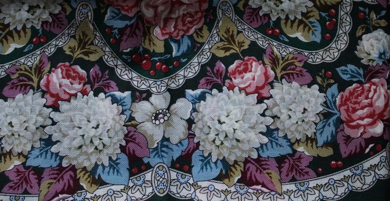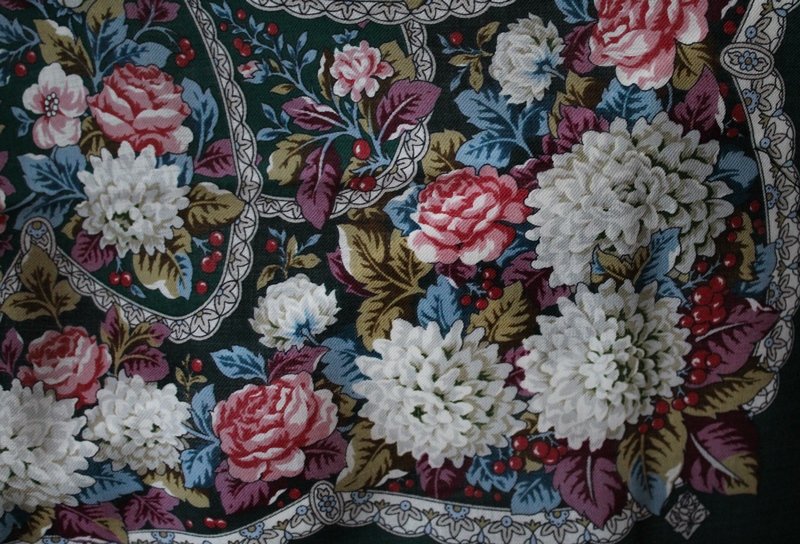 Покажу "Розовый сад", вид 18. Оказался не такой яркий, как на фото --это хорошо. Думала ,что он рыжий. Нет, фон красно-томатный или перец. Спокойная расцветка. Розы густо темно-красные. Красивый. Черный у лица не очень украшает, но с черным пальто неплохо.