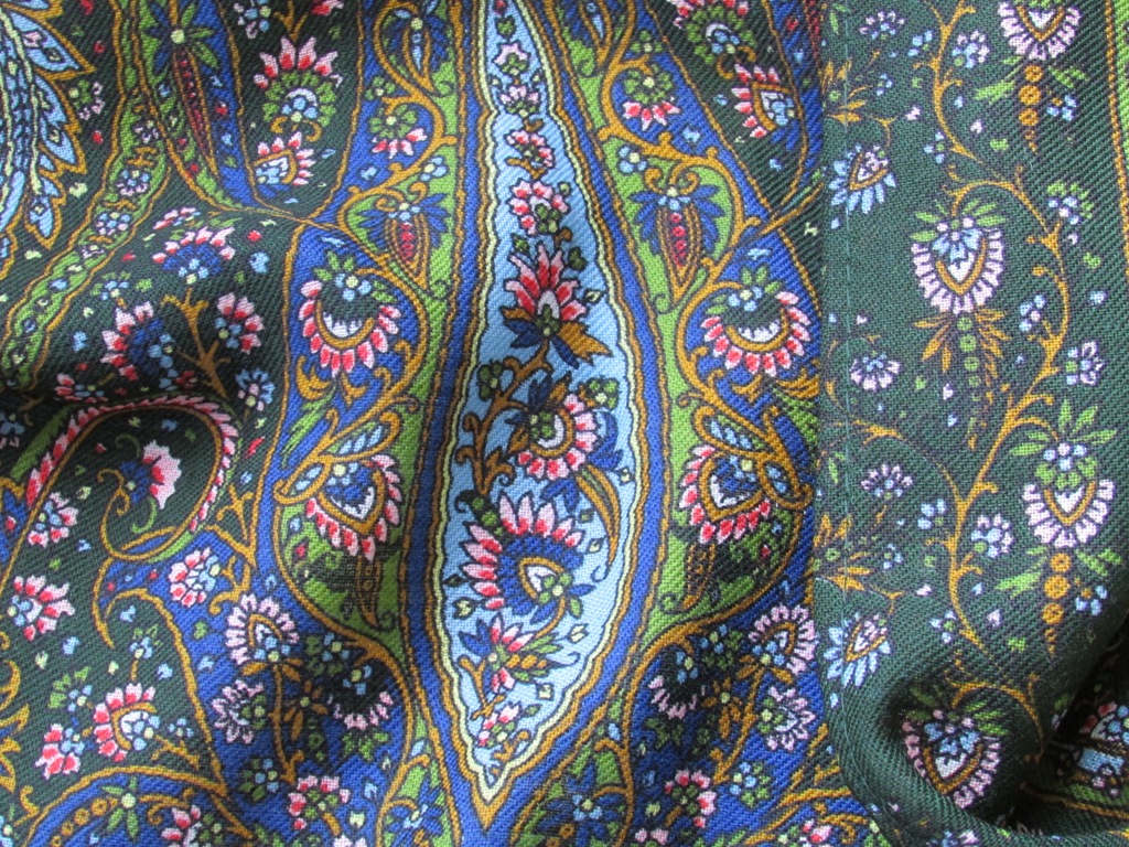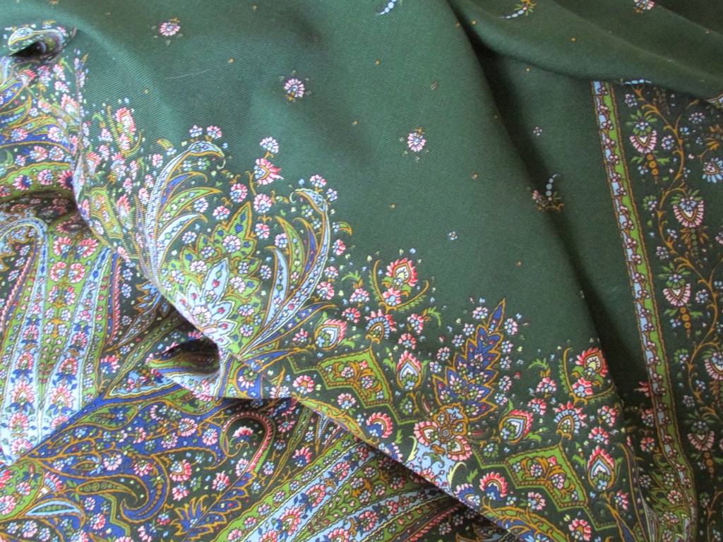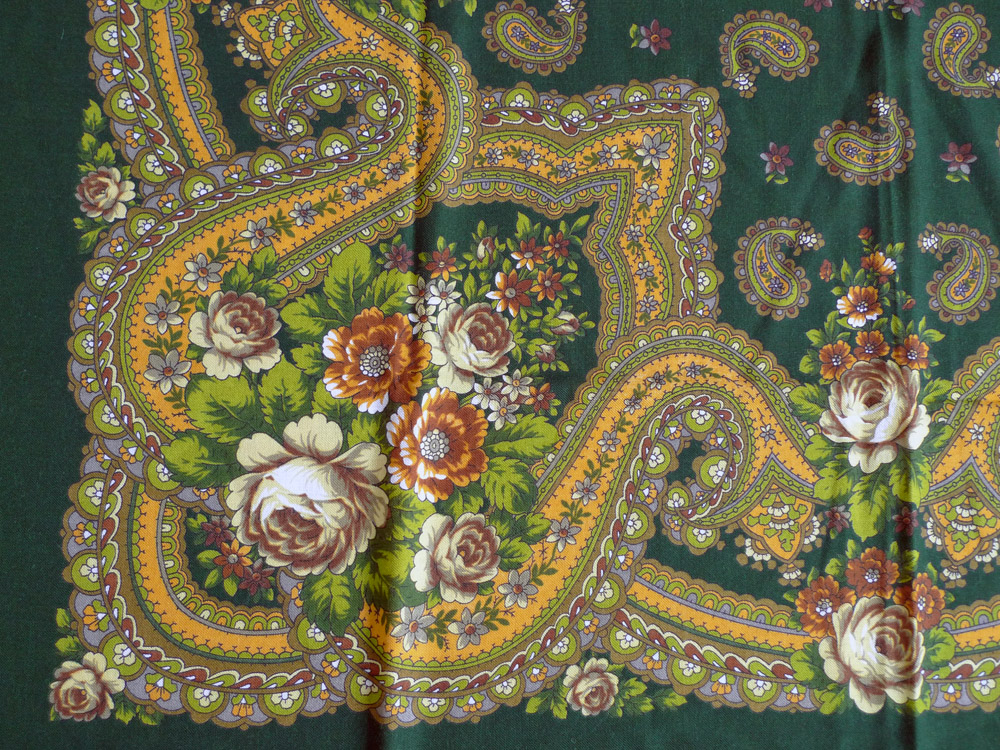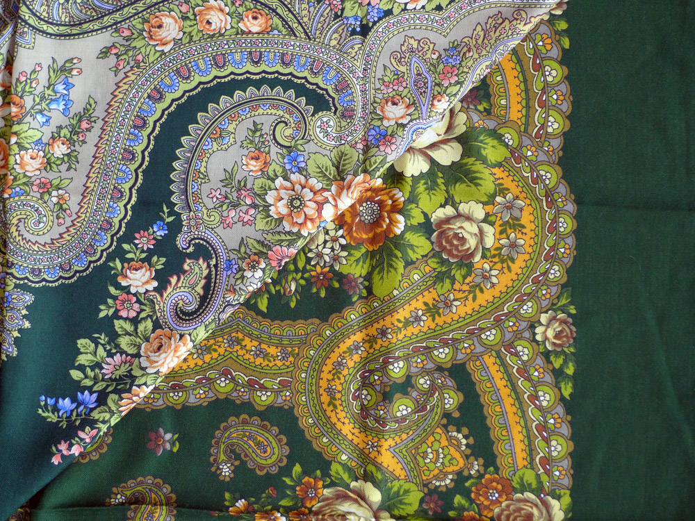 Платочек отправился уже к новой хозяйке, но хочу сохранить фотографии, т.к. в архиве только один снимок этого колорита. Удивительный оттенок зеленого - довольно темный и густой, но при этом, словно, излучающий солнечный свет (как и весь платок). ::