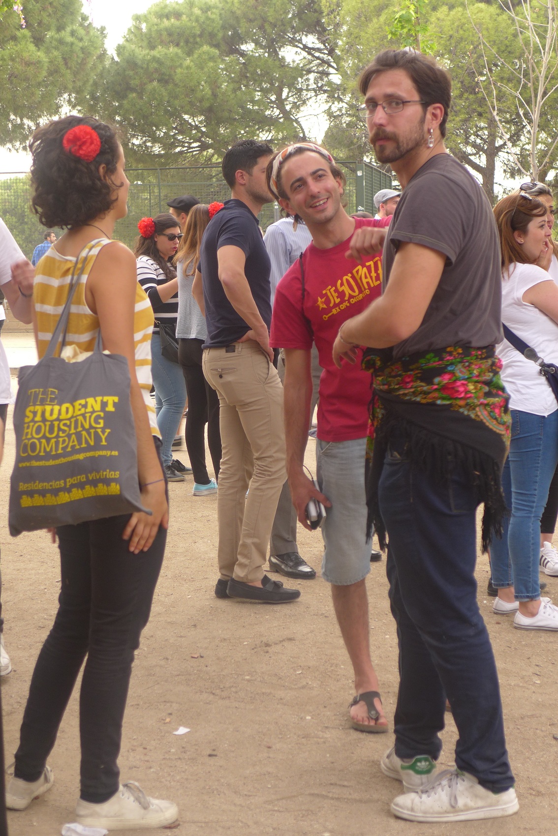 А тут относительно недавно, в мае на народных гуляниях в честь патрона Мадрида Сан Исидро, мой уже более наметанный глаз выхватил новую жертву глобализации и культурного присваивания, да еще...о, боже! на мужчине: мимо пройти я не могла. Мой патриотизм потребовал объяснений. Парень ни сном ни духом снял, развернул, показал, оценил мою "Любаву". На допрос: "где взял?" сказал, что в том же магазине фольклорного костюма. Проходил мимо, понравился, купил. Для себя, причем.