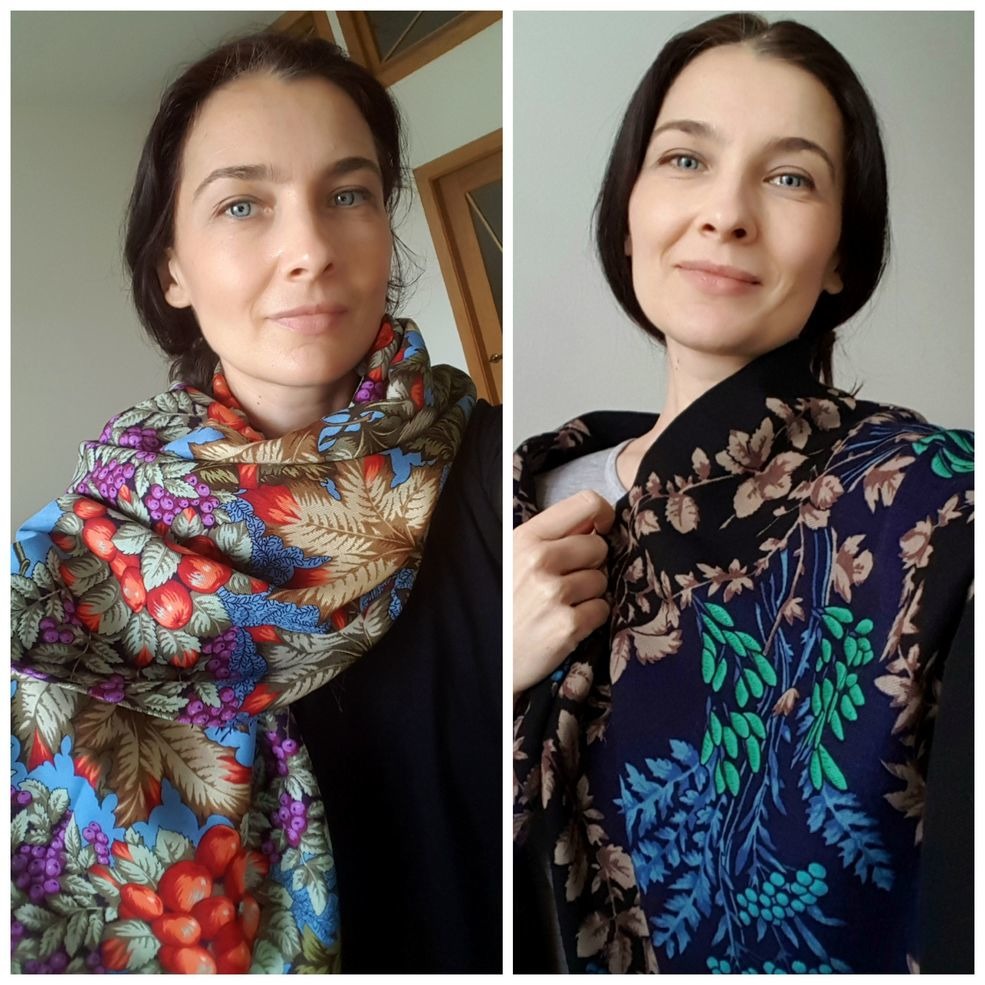 ой,еще ж другим углом сравнивала тоже..платок то асимметричный..я чаще ношу на голове именно тем углом,что с вьюном...вот и забыла...хотя именно из за гиацинтов когда то и куплен был первый платок,15 колорита.с него и началась любовь к этому рисунку.