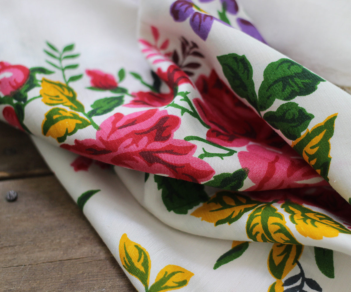 Вот этот, наверное - хлопок с вискозой (№3). Хотя подруга-коллекционер сказала, что это хлопковый шантунг, потому блестит, а другая сказала - чистый хлопок, саржевое переплетение. Но есть мнение, и даже не одно, что вискоза. В общем, шелковистый блеск присутствует. Этот платок мне напоминает весенний букет с фрезиями.