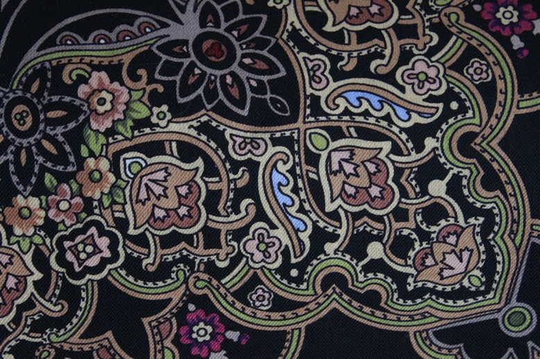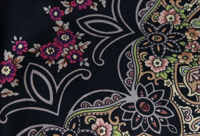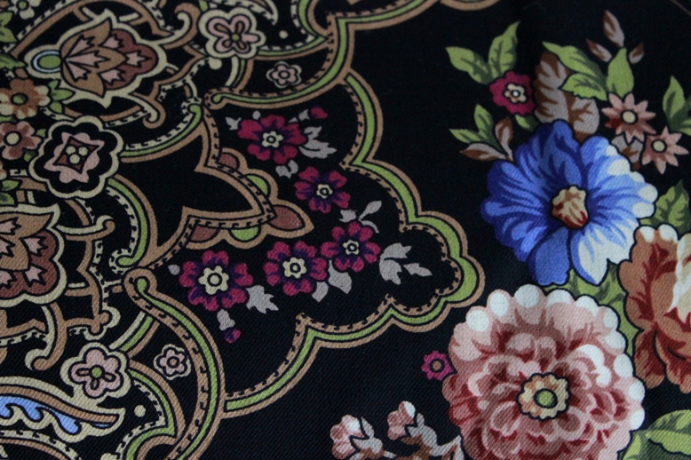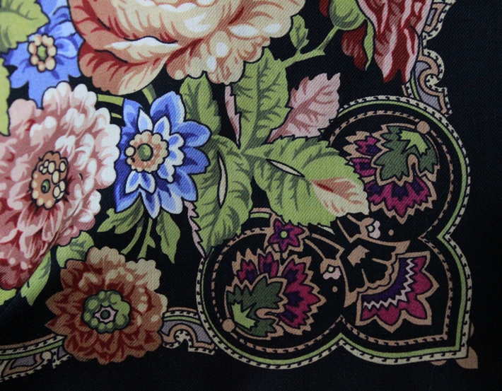 Я ужасно долго за этой Каймой охотилась, года два верных непрерывной охоты. Редкий платок, не чаще встречается, чем Цыганка Аза 20. Я вижу в этой золотой Кайме царскую мантию. По-моему, это невероятное сочетание золота и бирюзы, что-то из области ювелирных сокровищ, Оружейной палаты сокровищ.