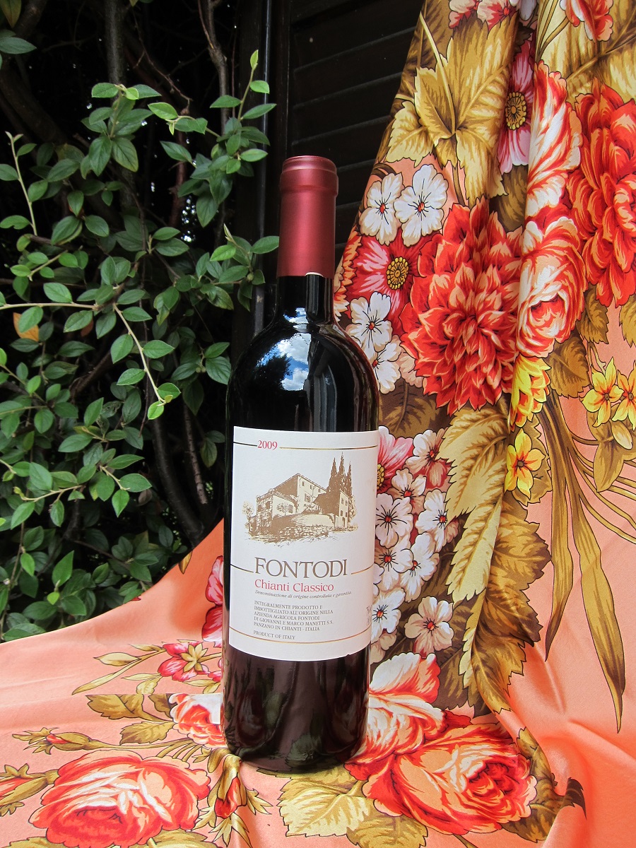 Самое, наверное, известное итальянское вино - Кьянти. Ферма Fontodi, Кьянти Классико. Стопроцентный Санджовезе. Куплено в итальянский полдень. Потому и фон такой выбрала ))).