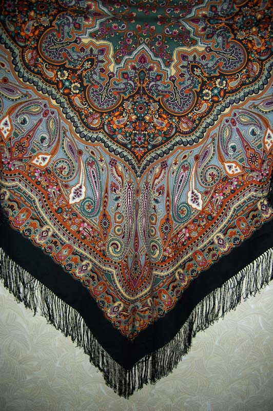 Мне мама отдала свой платок, который у нее уже много лет. Я не уверена, что это изделие павловопосадской мануфактуры, но может быть...? Бахрома шерстяная и очень уж похожа на павловопосадскую по способу крепления.
