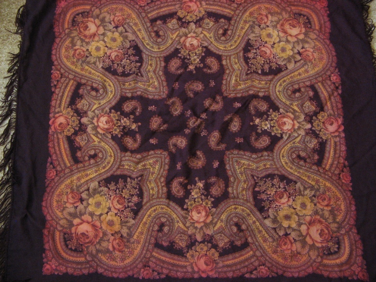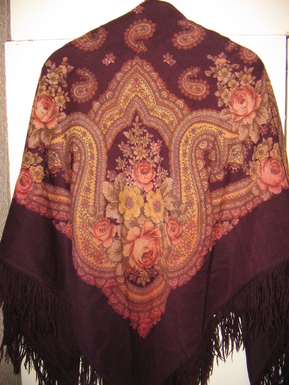 Дорогие форумчанки! У моей коллеги по работе нашелся вот такой платок. По виду он павловопосадский. А вот, когда сделан, неизвестно. Его нашли в сундуке у бабушки, хотели выбросить. Чудом оставили. Состояние его аховое: несколько дырок, цвета слиняли. Но рисунок по-прежнему красив. Цвет фона и каймы темно-вишневый. Бахрома у него шерстяная. Размер: 123х123. Очень хотелось бы знать его название и автора, примерный возраст. Помогите, пожалуйста!