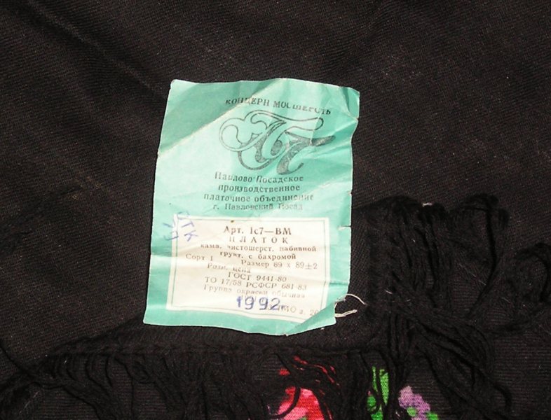 появился такой платочек. Названия на этикетке, понятное дело, нет. Год выпуска - 1992. Бахрома из шерстяных ниток, под бахрому вшит кусочек ткани с номером на нём - 76. Хотелось бы услышать ваши мнения, кто автор этого малыша.