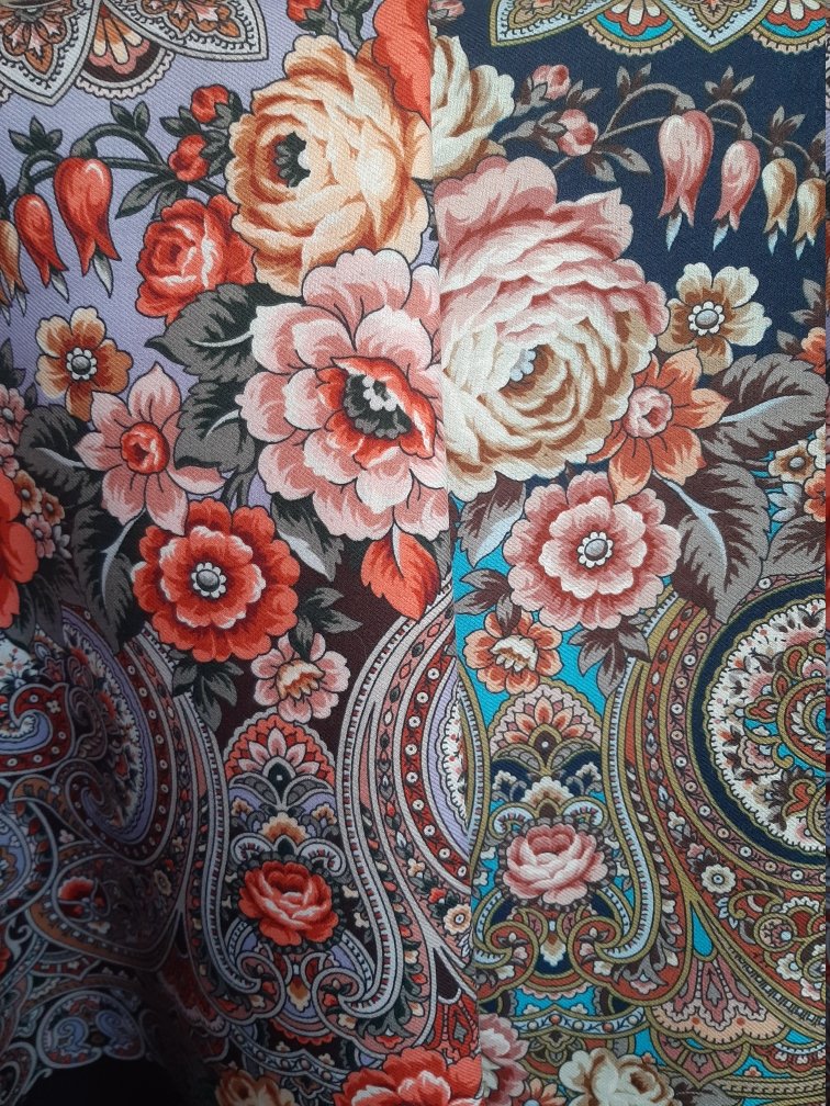 Добавлю сравнений "Мчится тройка" в 14 колорите с другими шалями, оказавшимися под рукой. Фото с телефона у окна в комнате. В жизни краски чище, на фото получилось чуть больше припыленности (или я так вижу).