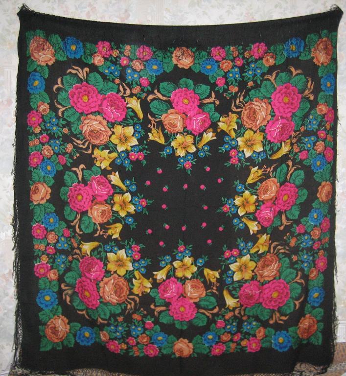 Это платок, видимо, японский. Он есть в нескольких размерах. Я встречала в инетных описаниях размер (без бахромы)132х132 (любимый японский размер) и 150х150. Обычно о нём пишут "русский" или "павловопосадский", но однажды я наткнулась именно на "японский в русском стиле".