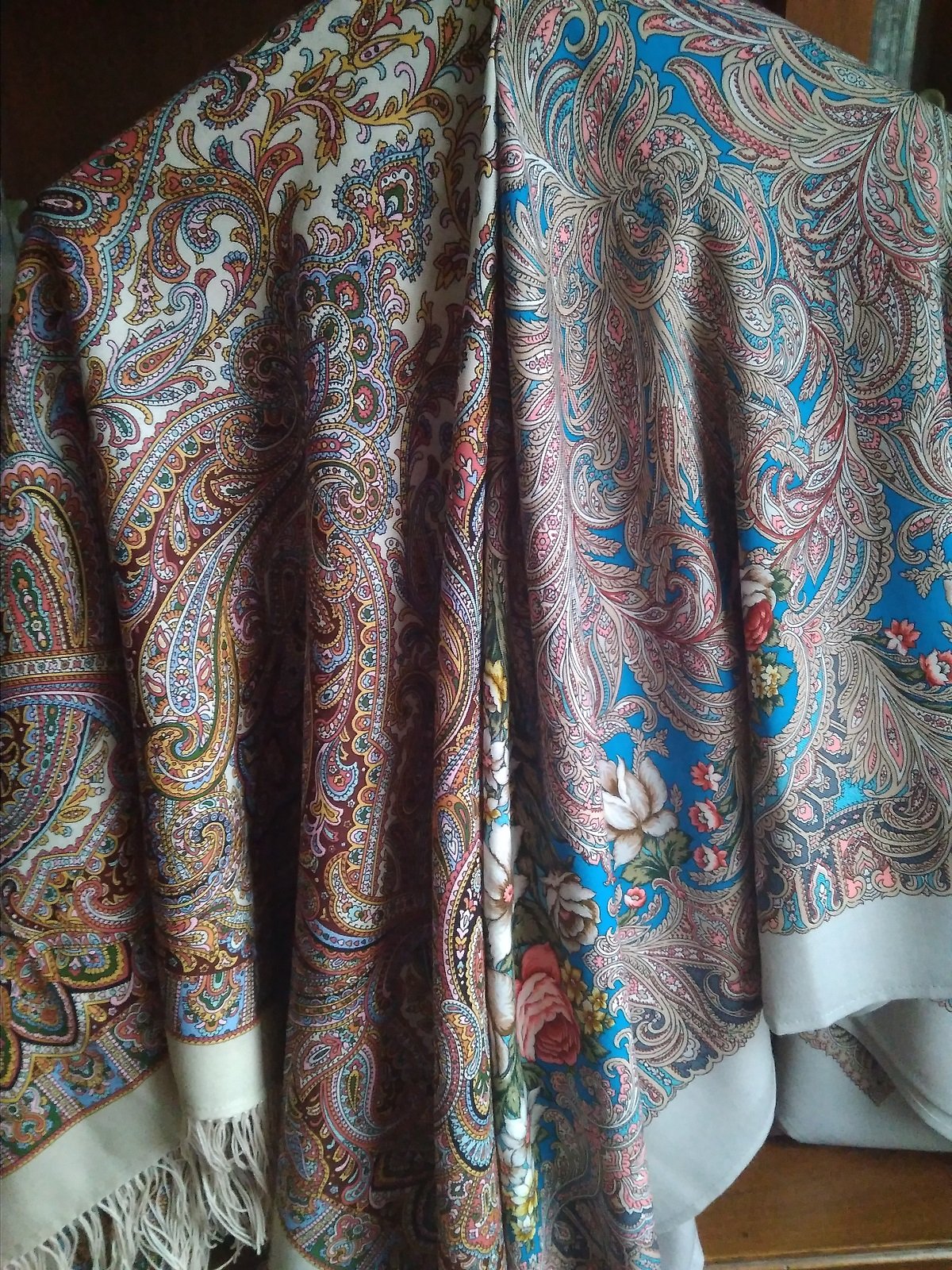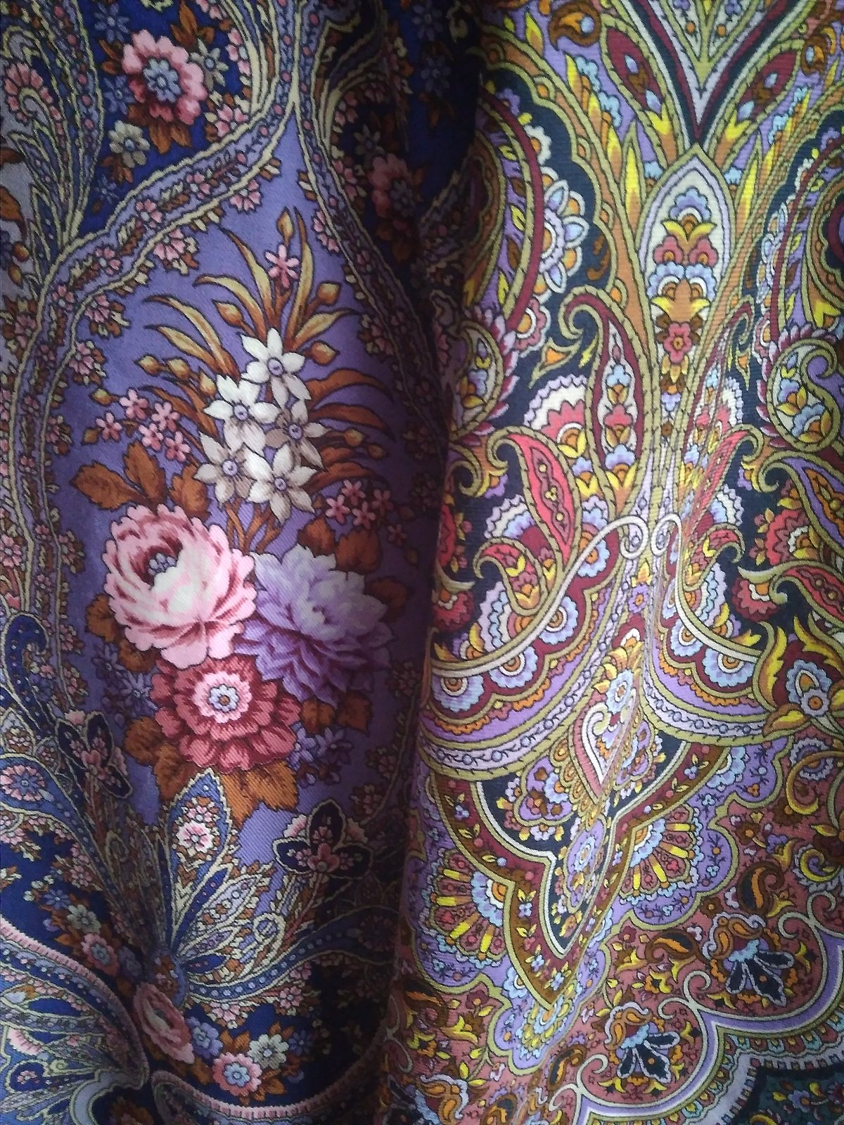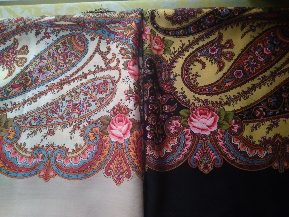 На фото получились как сквозь дымку, в реальности платки более яркие