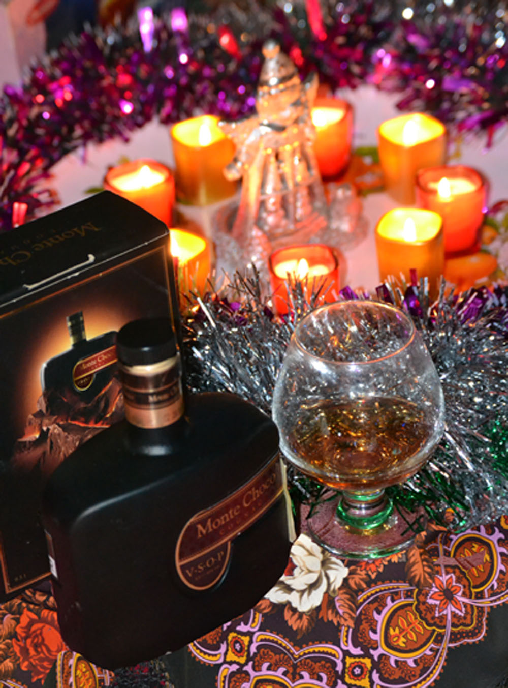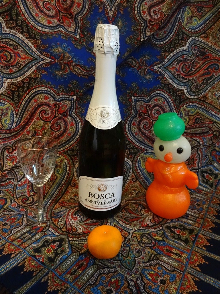 И у меня есть повод заглянуть в тему "Платки и вина". "Шафран"+ шампанское.... С этим снеговиком в глубоком детстве играла я, а сейчас - мой сынулька.
