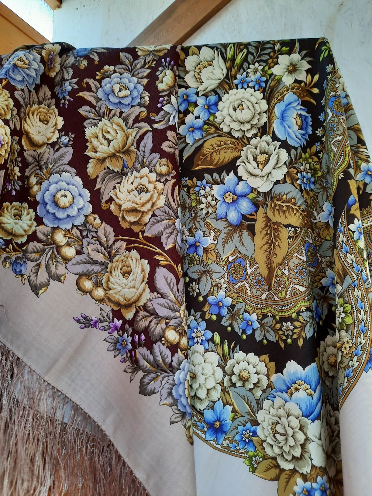 Таня Имбирь, есть есть похожие цвета. Соседки бы сказали один и тоже платок. Но мы то знааааааеем, что Тот Федот, да не тот. Розы цвет одинаковый и голубые всплохи. Красота!