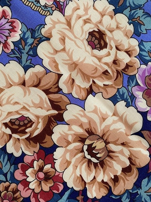 Цветы объемные, напоминают розы Дадоновой. Вот держу в руках шаль--вижу: розы коричневые--кофе с молоком без розовости, где коричневые тени--красноватый шоколад; самый светлый оттенок розового на цветах--прохладный, светлая, пыльная роза. Остальные цвета: различные оттенки баклажана ( темные и светлые), коричнево-красные-"вареная вишня"; бледные бежево-розовые (цвет пудры); разные по интенсивности цвета и насыщенности оттенки лилового; букетики по центру--это светлый, бежевый-розовато-желтый песок, без оттенка лимонного. Оттенки синего-чистые в основном, цвет каймы-очень темно-синий, наверное классический, без бирюзы. А, вот некоторые листики--сине-зеленые , светлые и есть совсем темные--как бирюза или синие тона хризоколлы. Как то так...