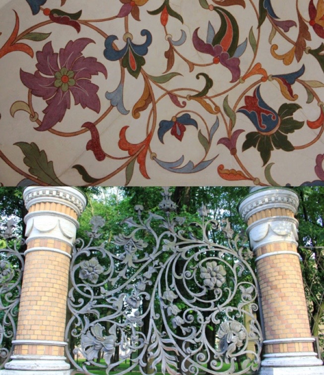 Цветок страстоцвета можно увидеть и на решетке Михайловского сада, орнамент которой решен в русском стиле, напоминающем росписи храма Василия Блаженного.