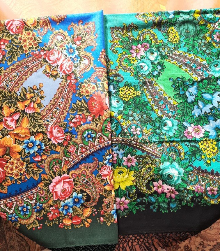 А моя шаль тоже почти монохром - "всё стало вокруг голубым и зелёным".... Таких красок на современных платках не припомню. Такие же, но не такие. Или на современной ткани по-другому смотрятся.