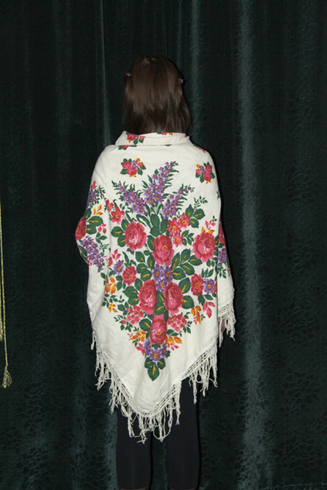 Вашей дочке очень идет эта шаль: яркие цветы на тепло-белом фоне.
