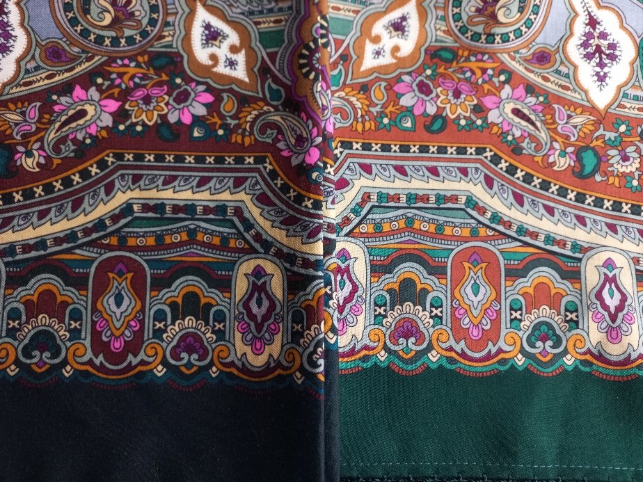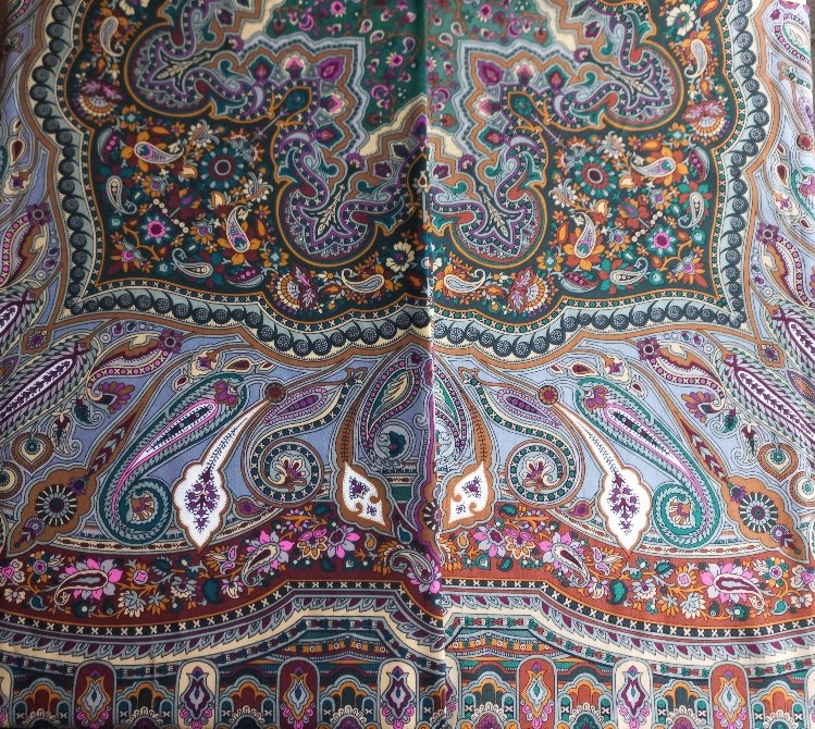 Шаль стала темнее, контрастнее. Кайма темнее. Рыжая полоса перестала быть рыжей, а стала цвета коньяка. Фиолетовые узоры стали ярче, горят игриво. Зелёная кайма стала темнее. Все эти изменения мне нравятся. Единственное жалко - широкая полоса с узором на сером фоне перестала быть "мягкой серой замшей". Узор на ней стал более четким, контрастным, ярким, более заметным, сам цвет серого немного другой и эффект мягкости замши ушел. Но, конечно, если смотреть в общем, то тот эффект замши подходил к мягкости шали прежнего выпуска, а новой шали и не нужен. Пусть он останется на прежней, где прекрасно смотрится.