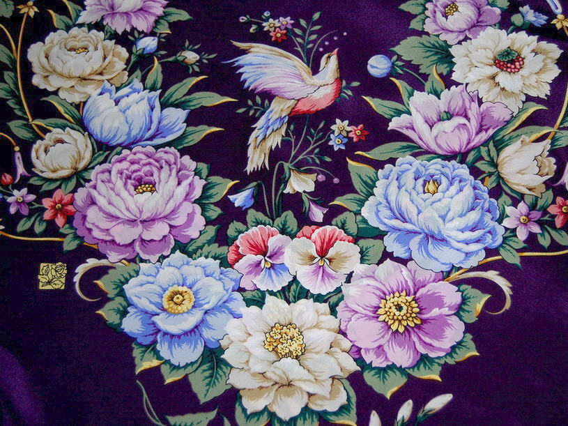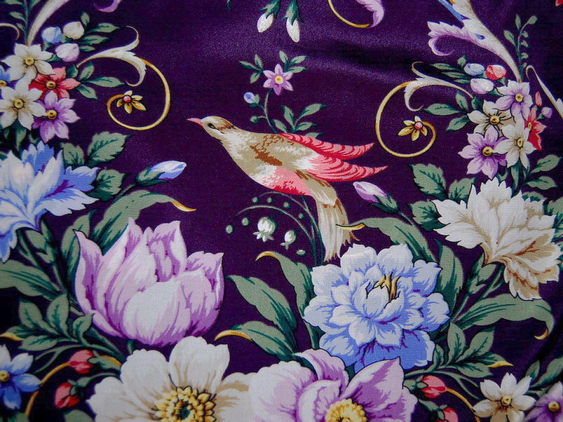 Цвет фона сложный, меняется в зависимости от освещения и времени суток: может быть как фиолетовым, так и явно сине-фиолетовым. Птичка на шали не одна)))