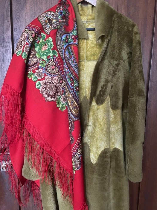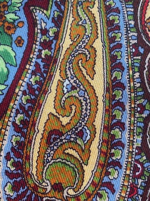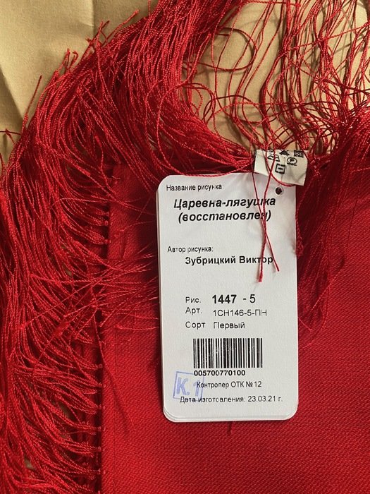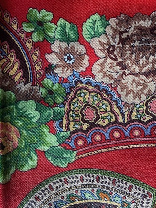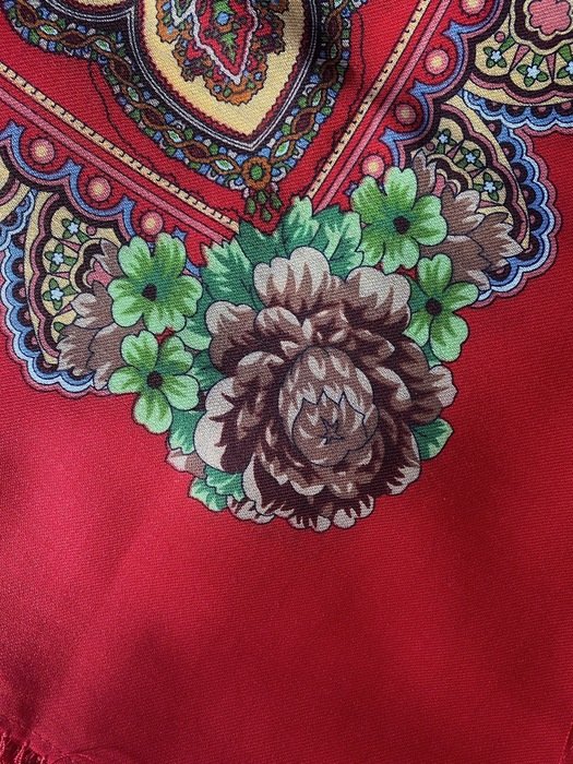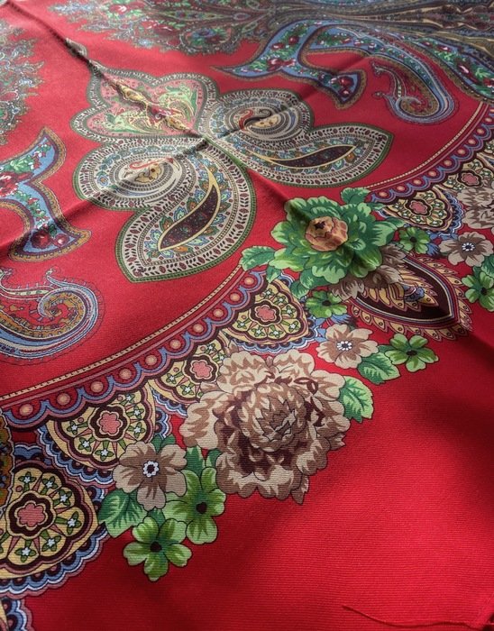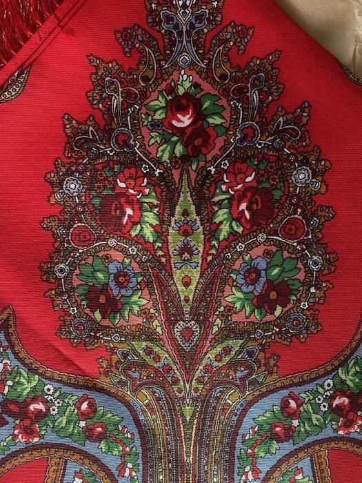 Платок красивейший не только своим рисунком, а главное цветом фона: не светлый, густой, классический красный, переливчатый, и ВНИМАНИЕ--меняющий оттенки! При разном освещении может быть очень разным!