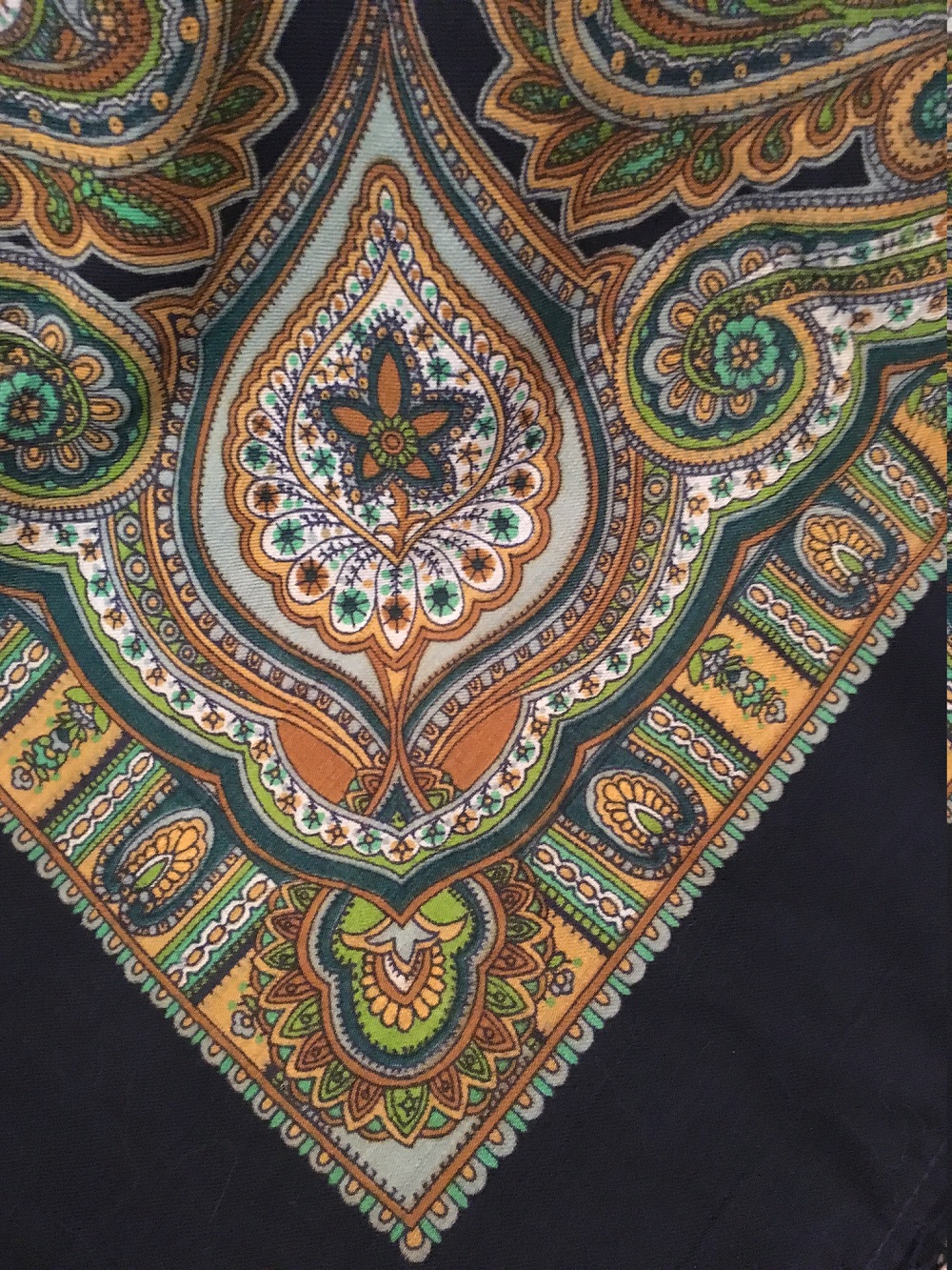 Сам платок не новый, но очень хорошо сохранился. Вопрос мучает - подвергался ли он стирке и надо ли его стирать уже мне (или лучше в химчистку). Цвет белого фона совершенно не белый, скорее грязно-бежевого оттенка, с сероватым налетом.