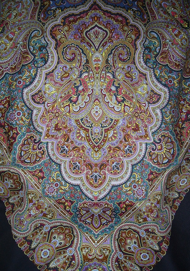 Ткань тоже понравилась, приятная, шелковистая. Шали в основном ношу в драпировке, эта ложится без проблем. Фото (со вспышкой) конечно, не передаст всей красоты :D нравится ещё кайма- тёмно- синяя, почти чёрная. Хороший подарок от ППМ к Новому году!
