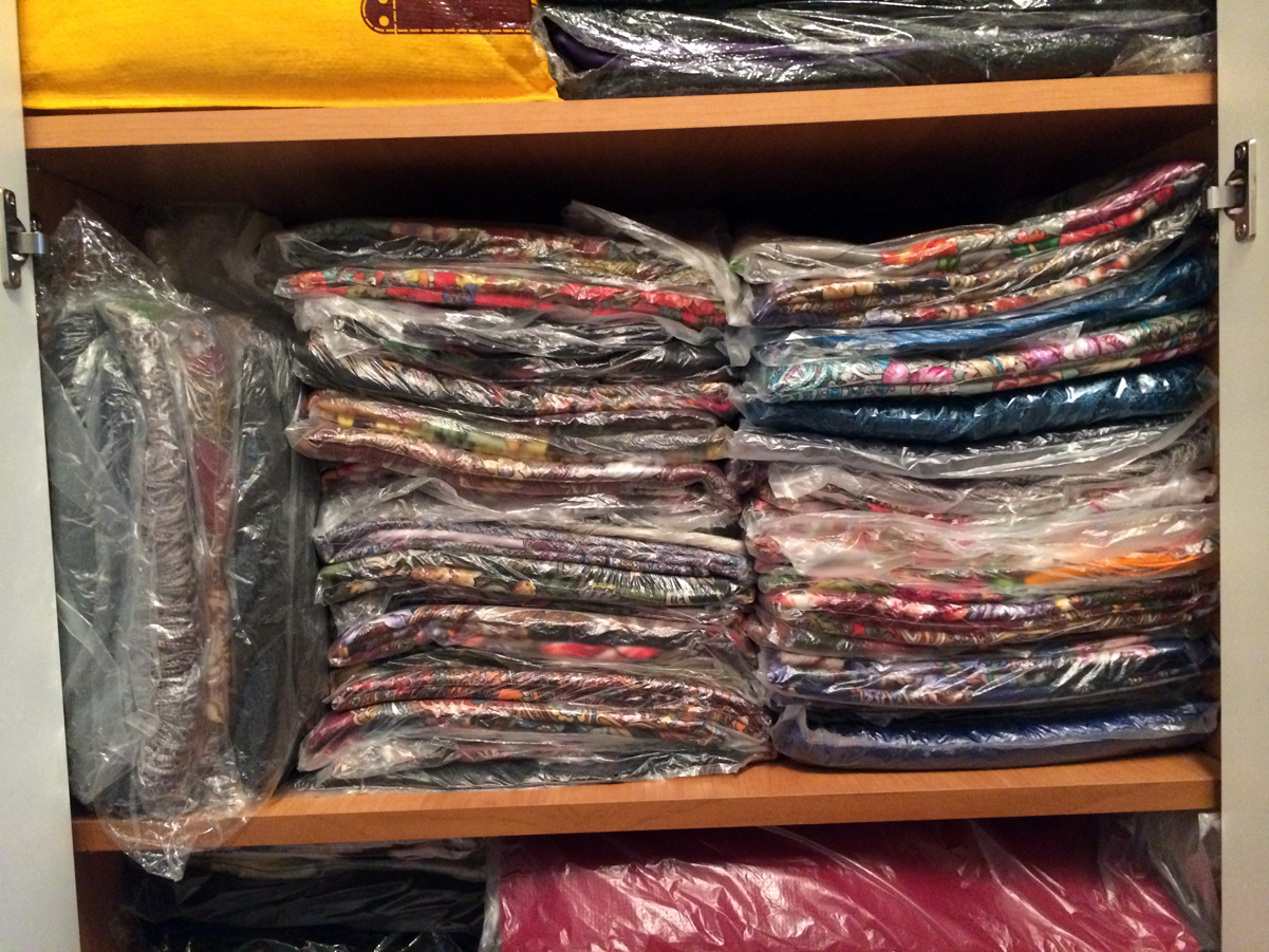 Еле смогла выделить полочку одну , там они и лежат в пакетах(сложены в три раза бахромой внутрь, она не мнется)). А те, что ношу в данное время просто складываю на уголке стойки бахромой в строну от крючков вешалок.