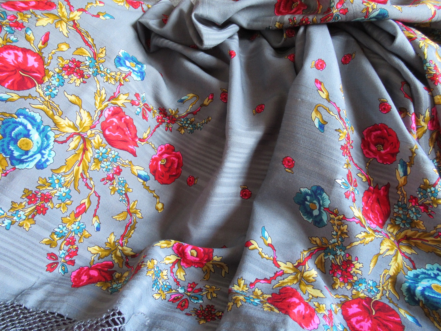 Мне тоже повезло. Есть в нашем городе магазин народных промыслов. Захожу туда посмотреть на керамику. Продают там и наши платочки из текущего ассортимента ППМ, только по высоким ценам, ничего особенного. А тут я смотрю и глазам своим не верю. Лежит у них новенький, с этикеткой Праздник Покрова 9 отличной яркой печати. Забрала себе.