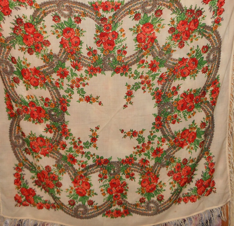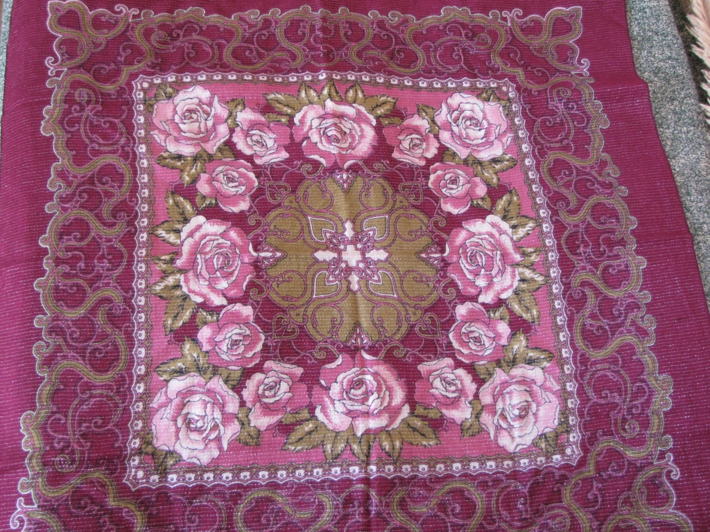 Прочла в этой теме, что в 80-х годах ПП мануфактура выпускала платки с люрексом. Вот, нашла в своих закромах. Может наш, посадский? Размер 84х84, наверно немного подсел. Красивое сочетание вишневого, бледно-розового и болотно-оливкового. Если б еще люрекса не было, было бы вообще замечательно.