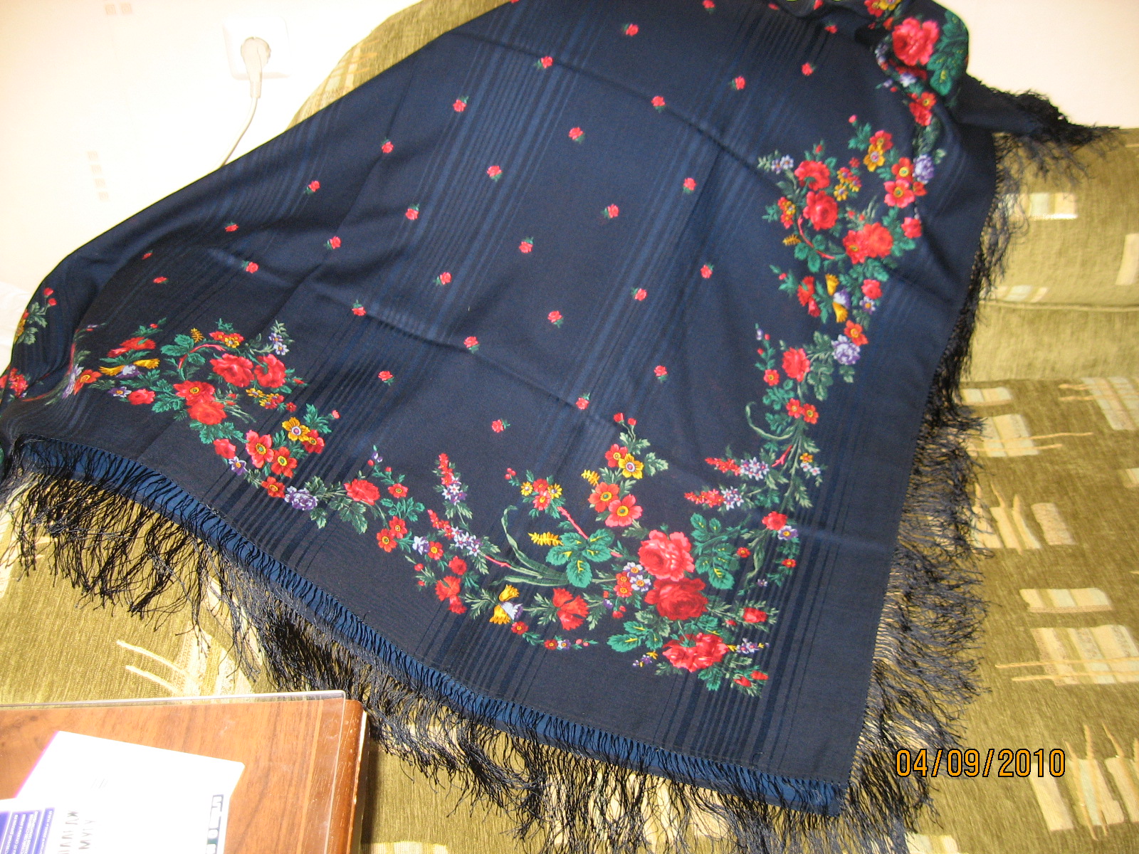 Провизор, рисунок изящен, лаконичен, трогателен. Глубокий темно-темно-синий... Интересный платок... Только как он будет к лицу? Может быть завязать его так, как вы Сирень демонстрировали? (Упрячется чуток темная серединка?).