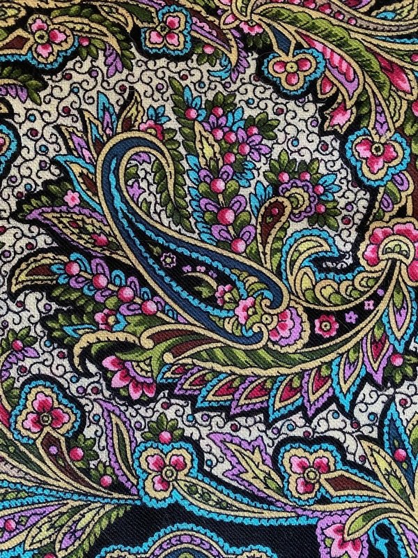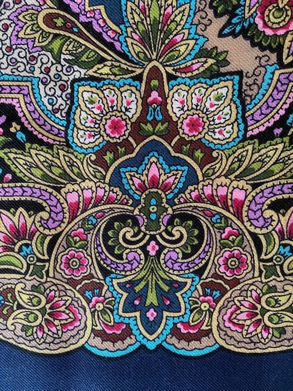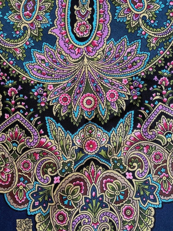 "Колдовская ночь", вид 14. Яркий в меру. Кайма темного цвета бирюзы. Не синий. Ожидала что то вроде синего графита, по фото казался сумрачным. Нет--красочный, но все умеренно. На мне акцентно вылезает зелень, розовый не перевешивает. Розовый очень светлого оттенка фуксии. Красивый бордово-коричневый и интересный серо-телесный.