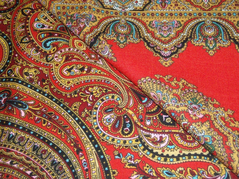Уважаемые дамы! Позвольте выложить скромное сравнение : "Восточный калейдоскоп" с красной серединкой, чёрной каймой и бахромой и с красной серединкой "Терем". Если из цветовой гаммы "Терема" исключить зелёный цвет - то получится в точности цветовая гамма "ВК" 1402-18 (красный, чёрный, розовый, бирюзово-голубой, горчично-желтый...). Автор у платков - один - Наталья Белокур.